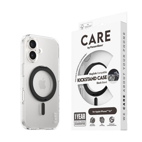 CARE by PanzerGlass iPhone 16 Feature Kickstand Case - MagSafe Compatible - Transparent / Black