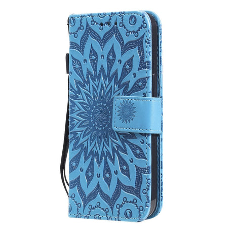 iPhone 15 Wallet Case w. Strap - Sunflower Engraving - Blue
