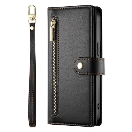 iPhone 17 Pro Flip Case with Card Holder / Zipper Pocket / Strap - Black
