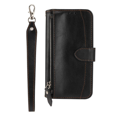 Samsung Galaxy A25 (5G) Leather Flip Case w. Zip Pocket & Strap - Black