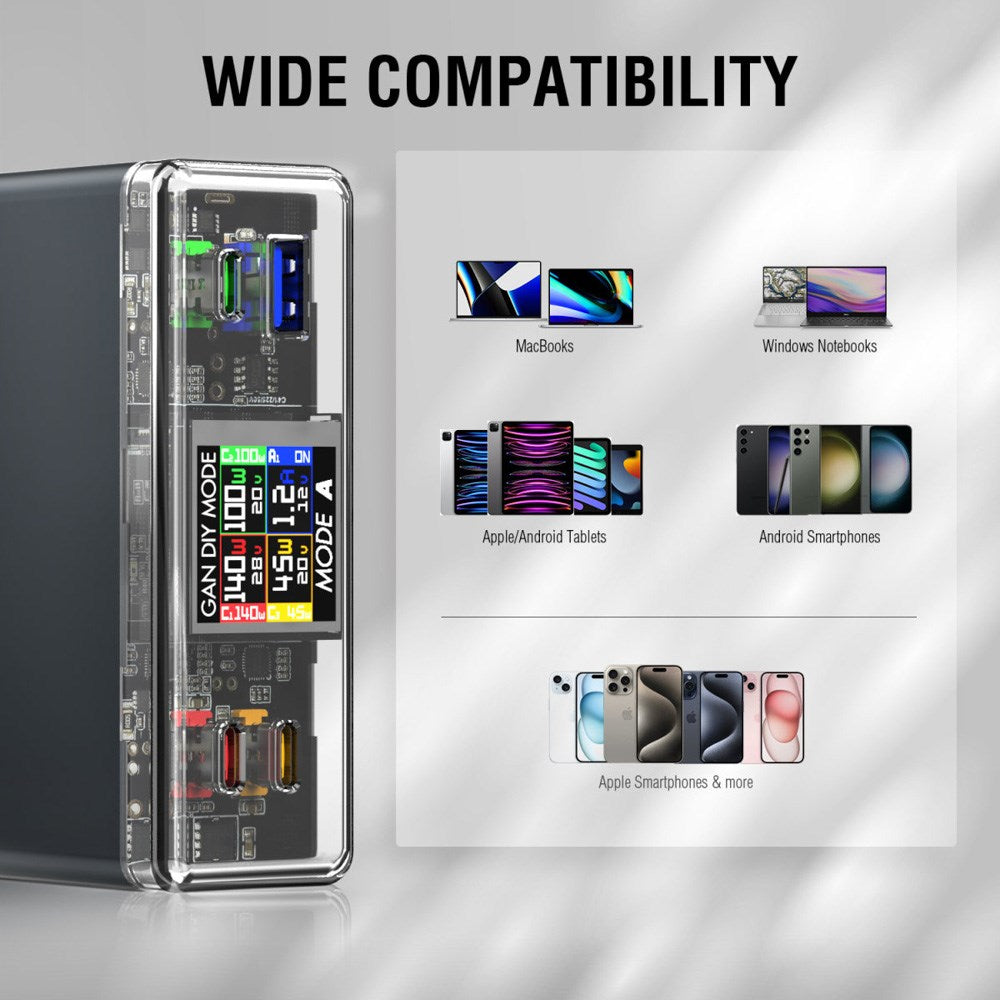 The advanced GaN technology provides a smaller, more energy-efficient charger that lasts longer and generates less heat. The integrated TFT display shows the charging status in real-time, allowing you to adjust as needed.