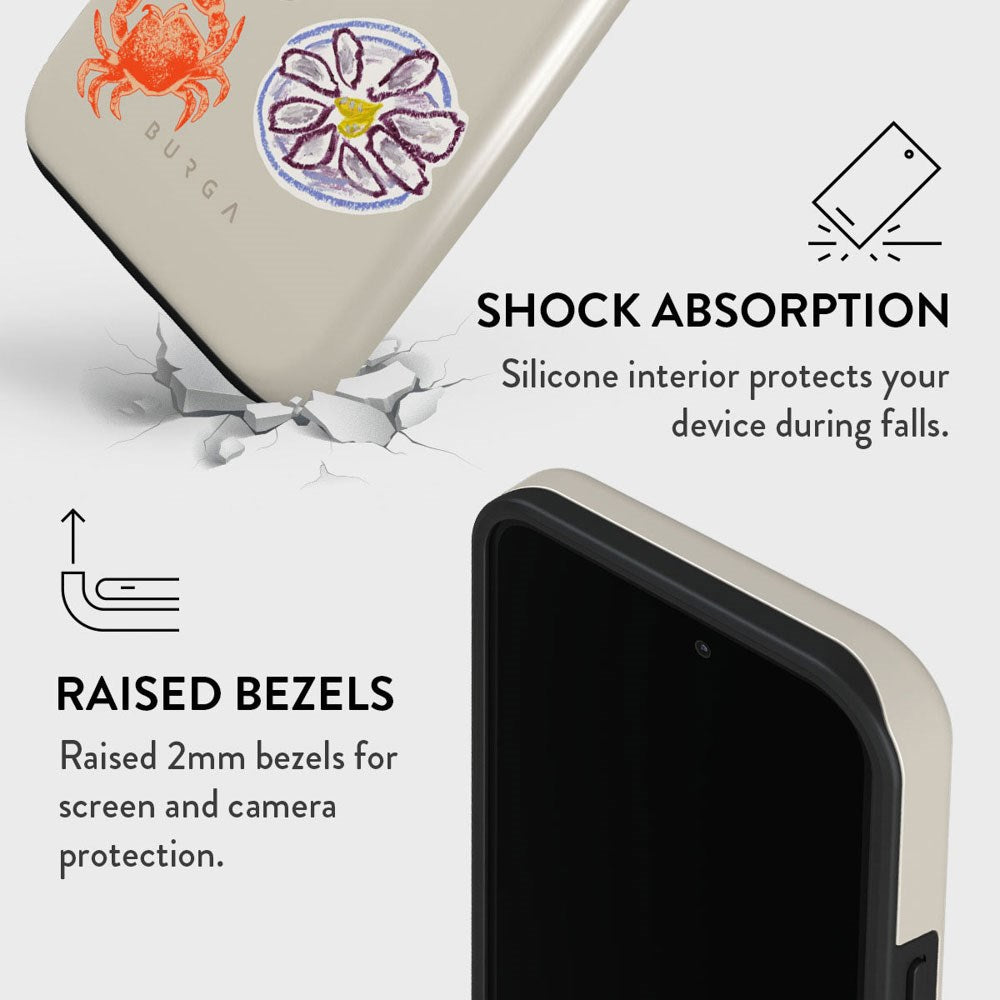 In combination with the case's exceptional visual design, Burga has given the case a unique protective function. The case is two-part, with an outer shell made of hard plastic and an inner layer made of highly protective shock-absorbing silicone.