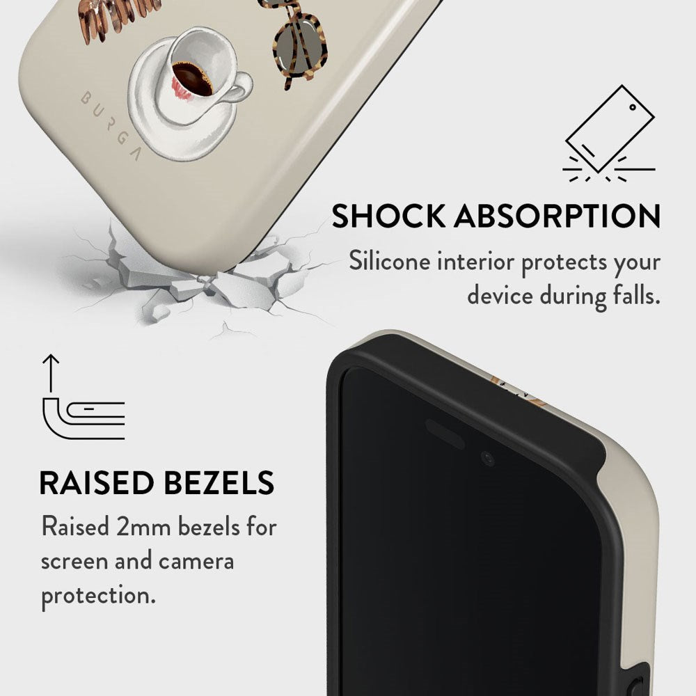 In combination with the case's exceptional visual design, Burga has given the case a unique protective function. The case is two-part, with an outer shell made of hard plastic and an inner layer made of highly protective shock-absorbing silicone.