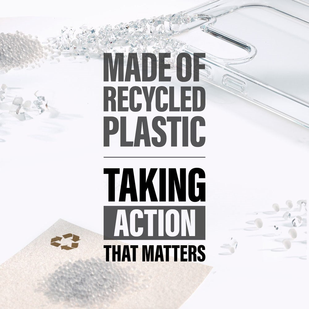 The case for iPhone 16 is made from recycled plastic and has openings for the speaker, camera, and flash, as well as allowing for charging while the case is on.