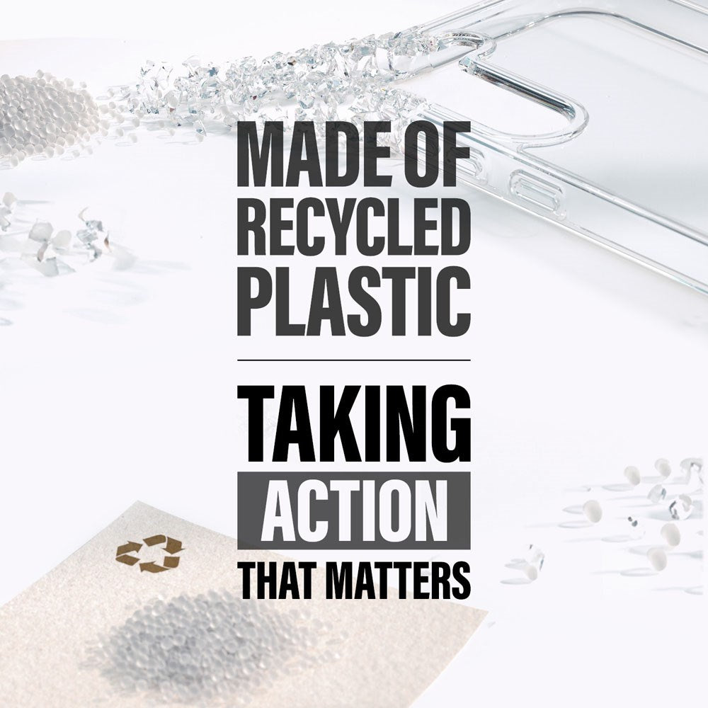 The case for iPhone 16 Pro is made from recycled plastic and has openings for the speaker, camera, and flash, as well as allowing for charging while the case is on.