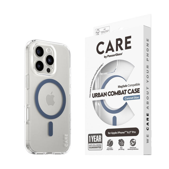 CARE by PanzerGlass iPhone 16 Pro FLAGSHIP Urban Combat Case - MagSafe Compatible - Transparent / Coronet Blue