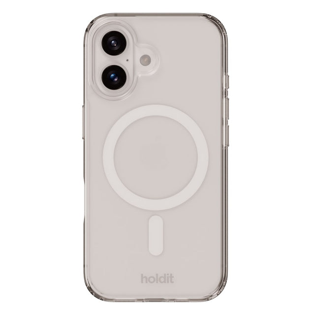 A stylish Holdit iPhone 16 Plus MagSafe case that is completely transparent, except for the colored MagSafe ring located on the back of the case.