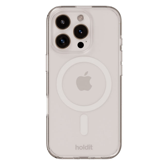 A stylish Holdit iPhone 16 Pro MagSafe case that is completely transparent, except for the colored MagSafe ring located on the back of the case.