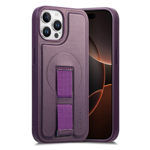 iPhone 12 / 12 Pro Hard Plastic Case with Faux Leather Back & Finger Strap - MagSafe Compatible - Purple