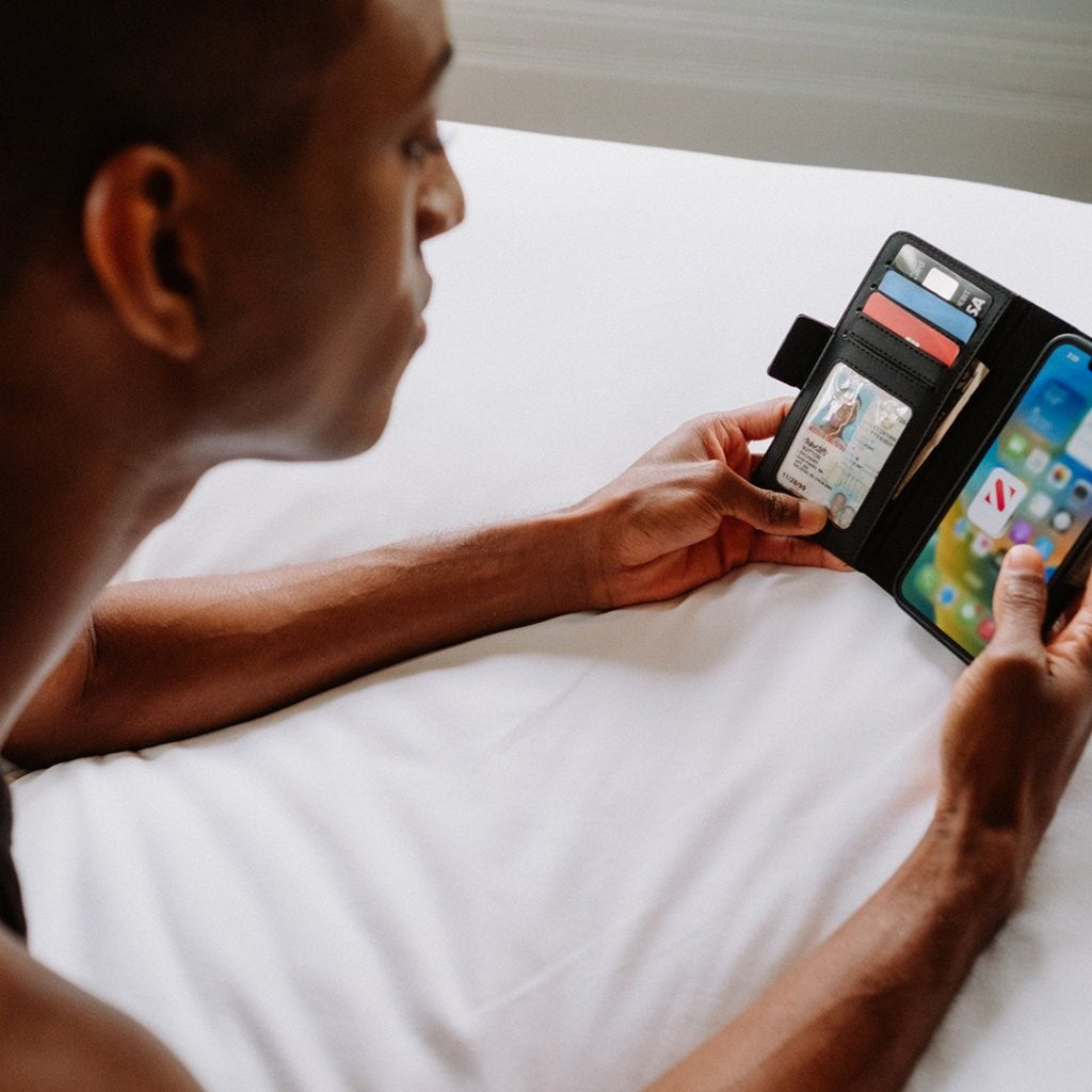 Inside, the left side has space for four credit cards and a large pocket for banknotes, receipts or similar. One pocket has a transparent panel, which can also be used for photos. in the Right side there is a case for iPhone 14 Pro. The case is made of hard plastic, which is lined with a nice fabric material on the inside. The case is attached with a magnet, so it is possible to remove the back case from the flip case if you do not want to carry the whole case.