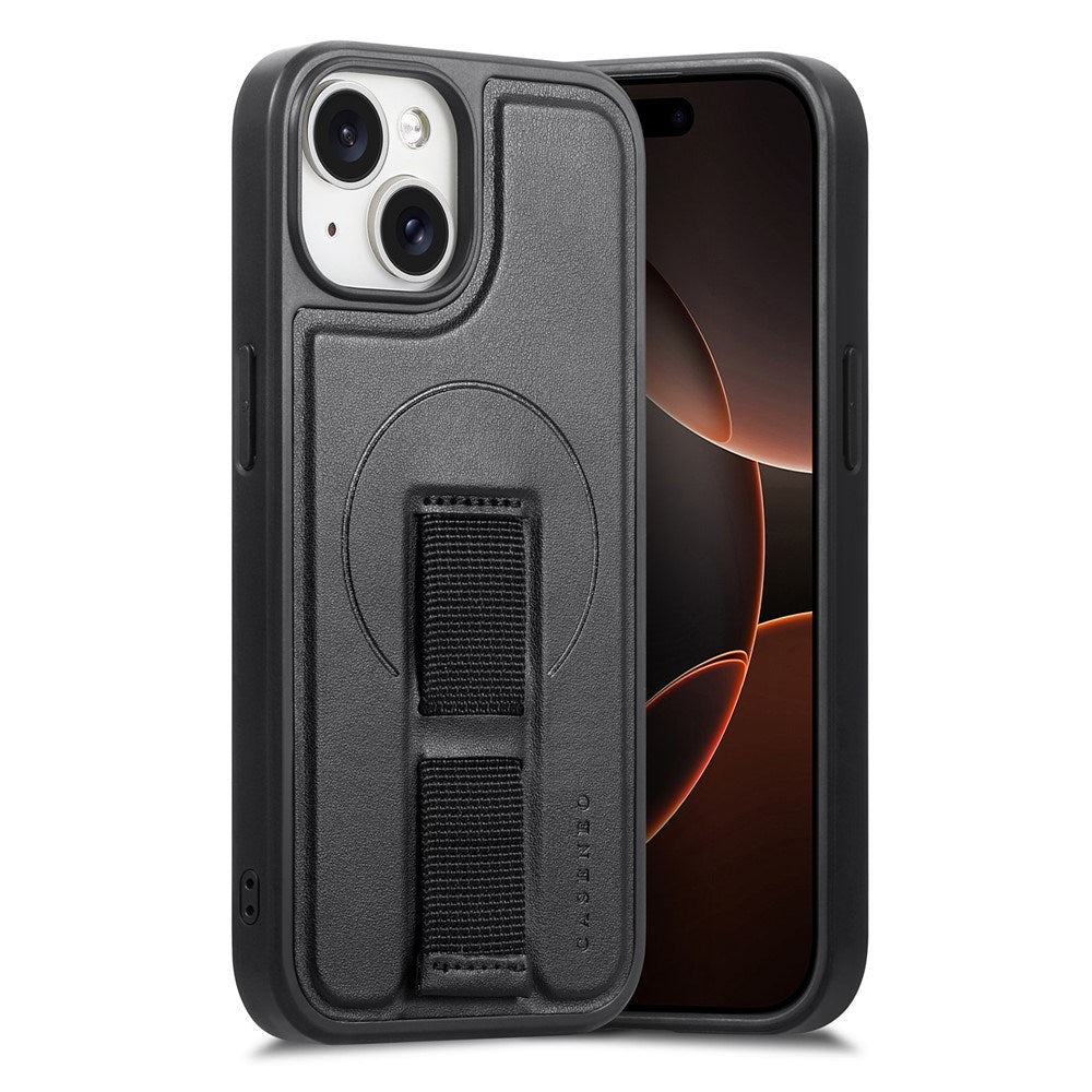 iPhone 15 Hard Plastic Case with Faux Leather Back & Finger Strap - MagSafe Compatible - Black