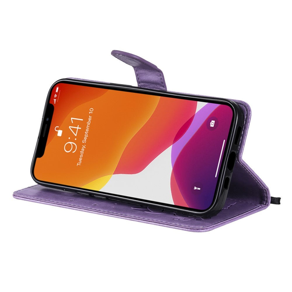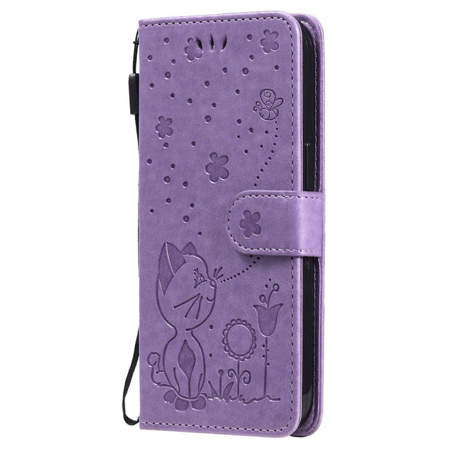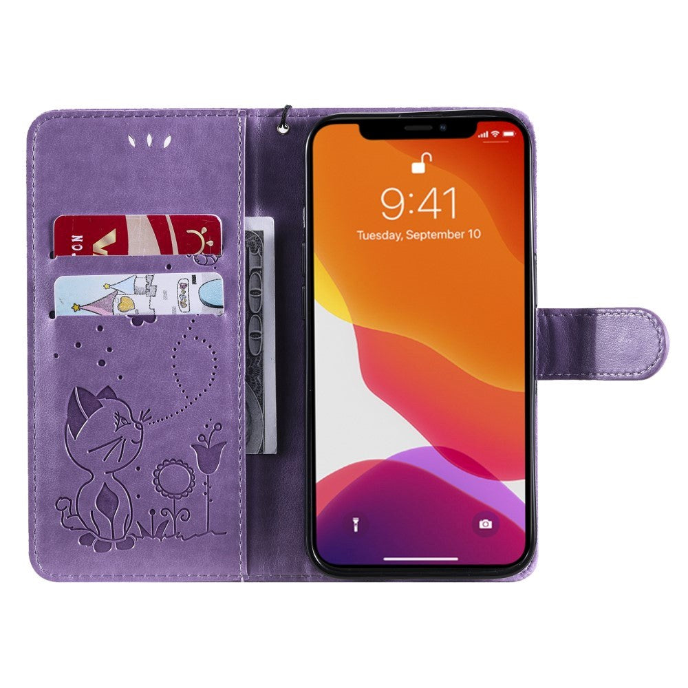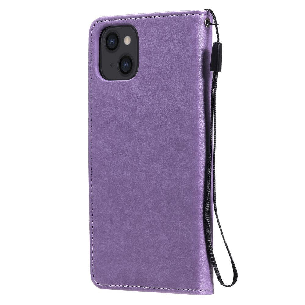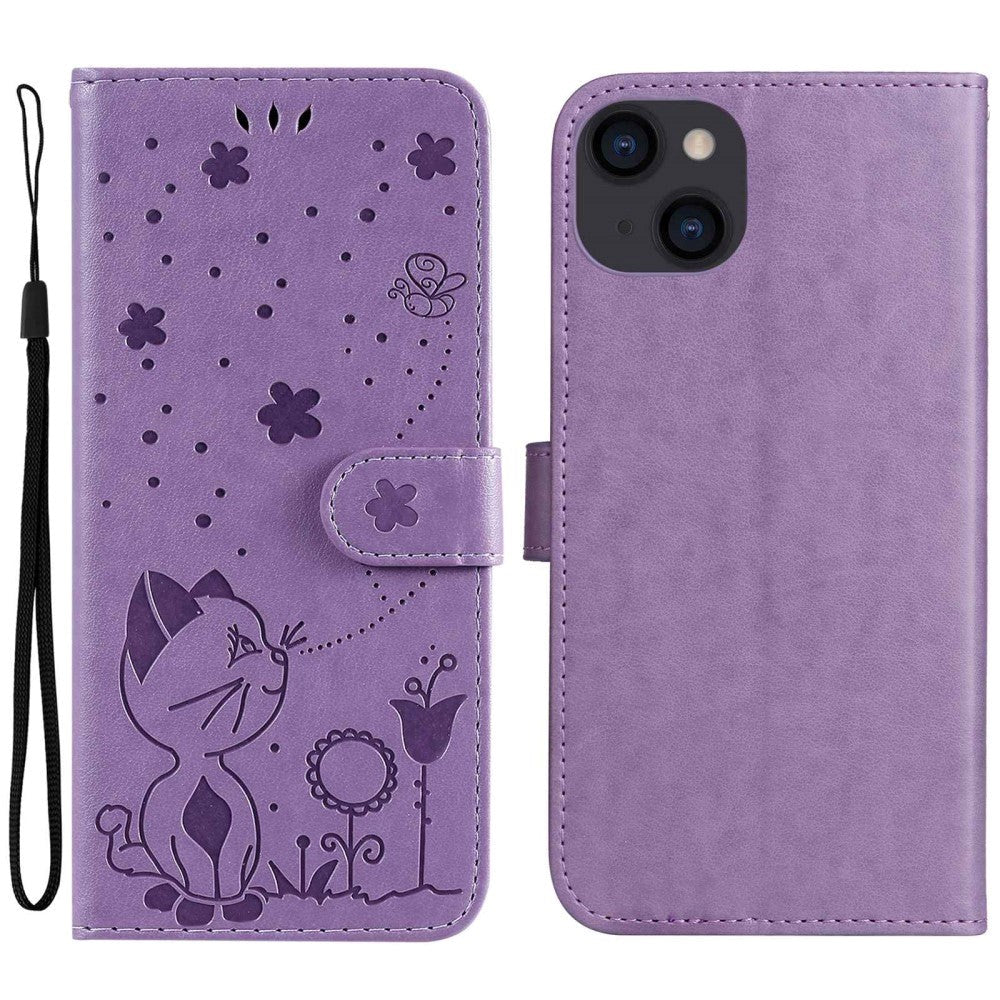 iPhone 15 Leather Flip Case with Wallet and Strap - Cat Engraving - Purple