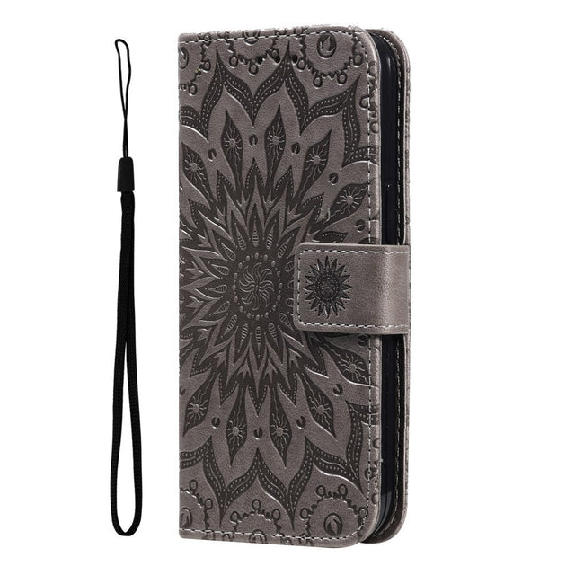 iPhone 15 Pro Leather Case with Wallet and Strap - Mandala Flower - Brown