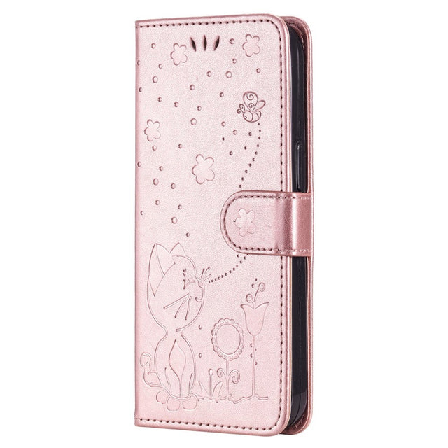iPhone 15 Pro Leather Flip Case with Wallet and Strap - Cat Engraving - Rose Gold