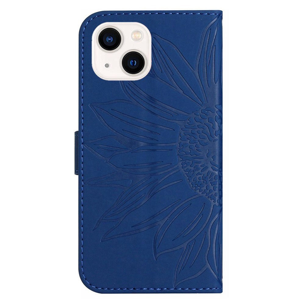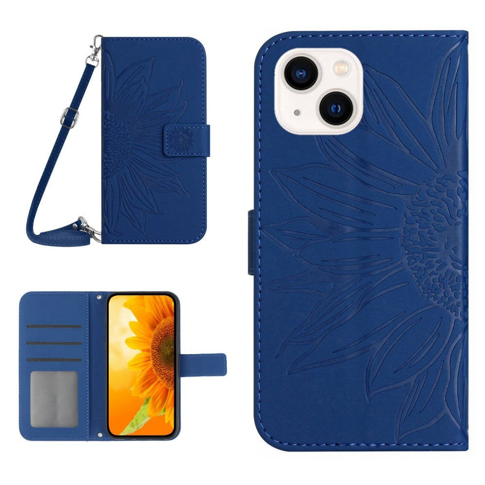 iPhone 15 Wallet Case w. Strap - Sunflower Engraving - Blue