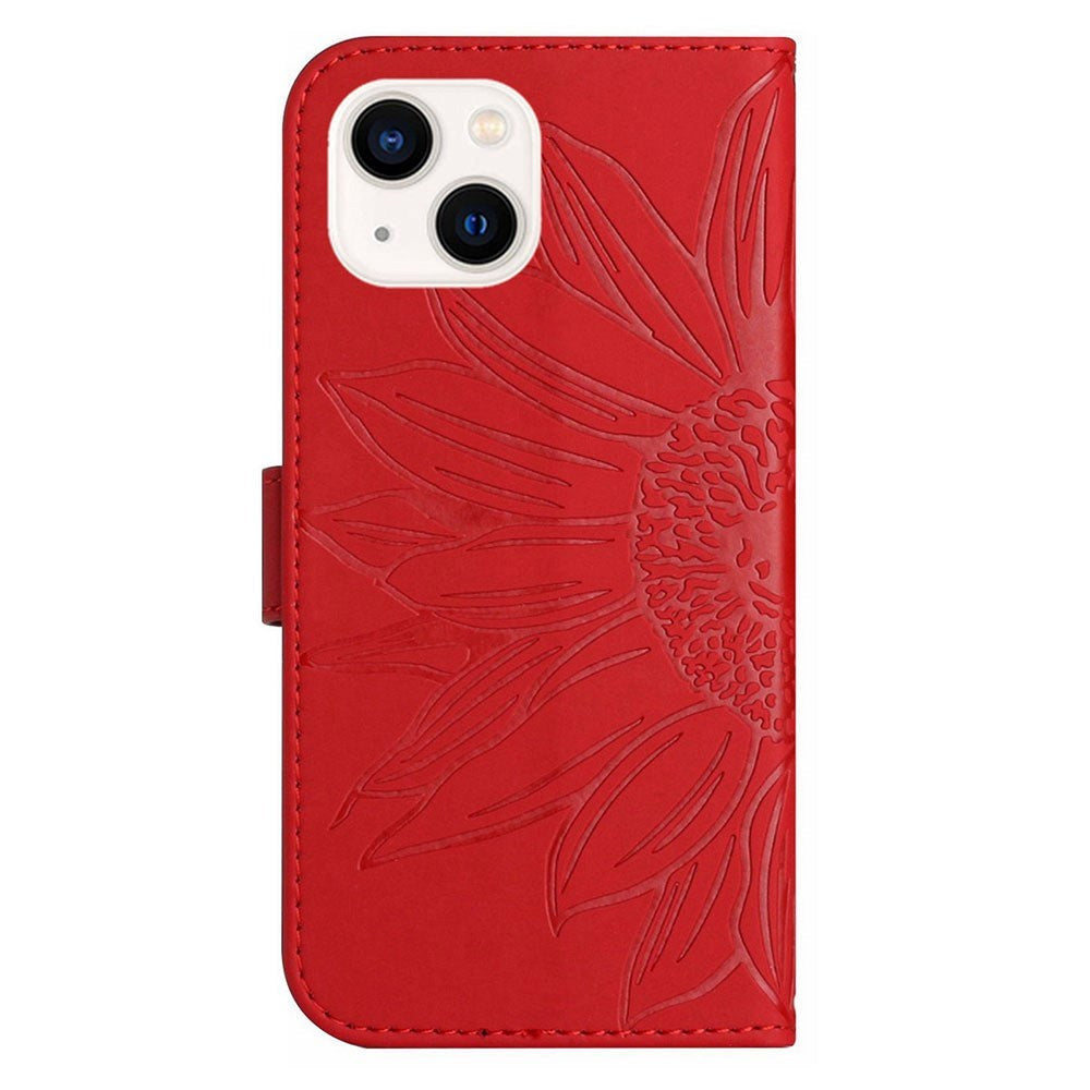 iPhone 15 Wallet Case w. Strap - Sunflower Engraving - Red