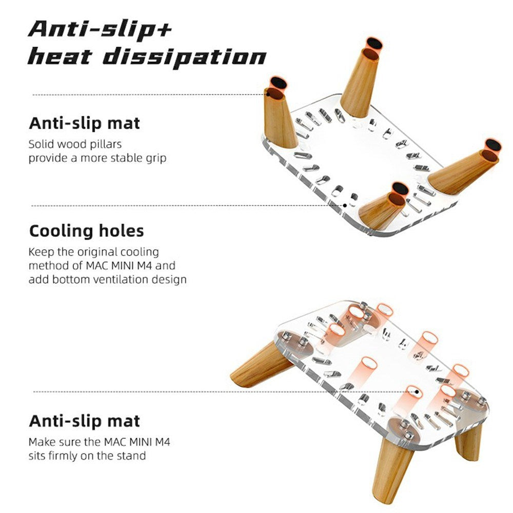 The stand is built with 4 solid wooden feet and 5mm thick, clear acrylic, creating a sturdy construction. The perfect combination of materials ensures both stability and a modern look, fitting seamlessly into any office environment. For extra security and stability, there are anti-slip silicone pads under the acrylic plate to keep your Mac Mini M4 / M4 Pro in place, as well as anti-slip pads under the solid wooden feet to provide additional protection against slipping.