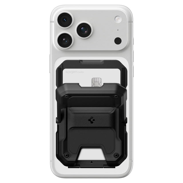 The Spigen Tough Armor Pro is a card holder designed for secure and practical storage of cards on the back of a mobile phone. It combines protection and functionality in a robust design that is compatible with MagSafe devices.
