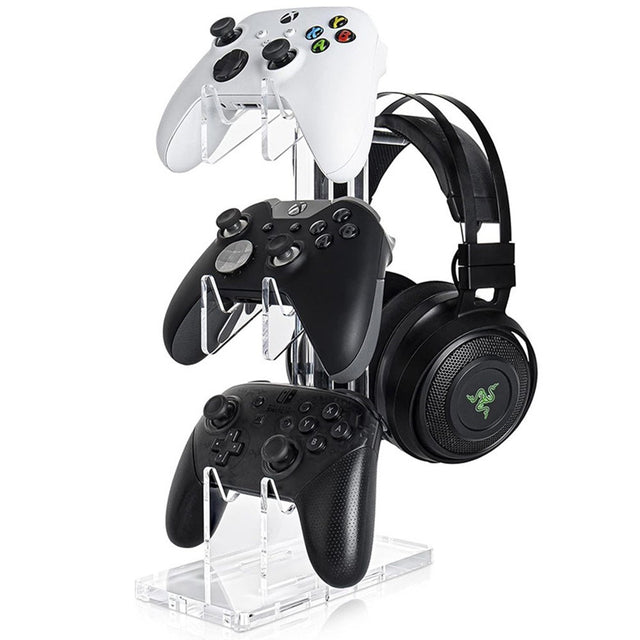 A cool stand is presented here, which can be placed on the table next to your games console. This stand is designed to hold 3 controllers as well as 1 headset. Whether it's Xbox or PlayStation controllers or your Nintendo Switch, they'll all sit securely in this holder.